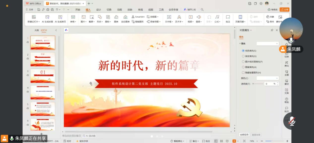 2025年10月25日下午,软件学院软件系统设计第二党支部开展了主题为“新的时代,新的篇章”党日活动。此次活动由党支部副书记朱凤麟同志主持,全体党员同志通过腾讯会议线上参会。