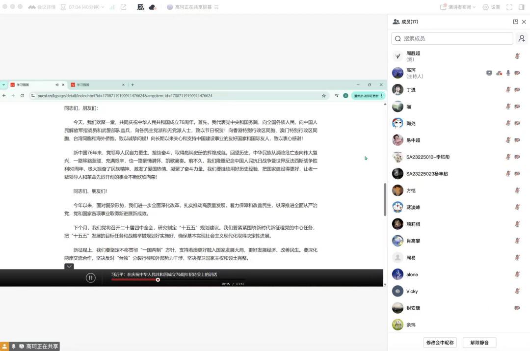 活动首先聚焦习近平主席在庆祝中华人民共和国成立76周年招待会上的讲话精神,由支部带领全体党员线上集中学习。大家重点领会讲话两大核心:一是持续运用历史经验推进国家建设,让老一辈开创的事业永葆生机;二是坚定不移贯彻“一国两制”方针,以高质量发展强经济、惠民生,坚决反对“台独”与外部干涉,捍卫国家主权。