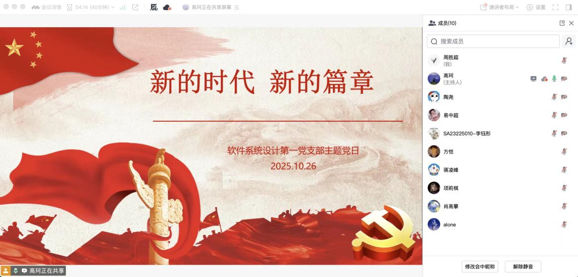2025年10月26日,软件学院软件系统设计第一党支部通过腾讯会议线上形式,组织开展“新的时代,新的篇章”主题党日活动。会议由党支部副书记高珂同志主持,有效覆盖因实习等原因无法线下参与的党员,确保理论学习全员同步、思想教育不脱节。