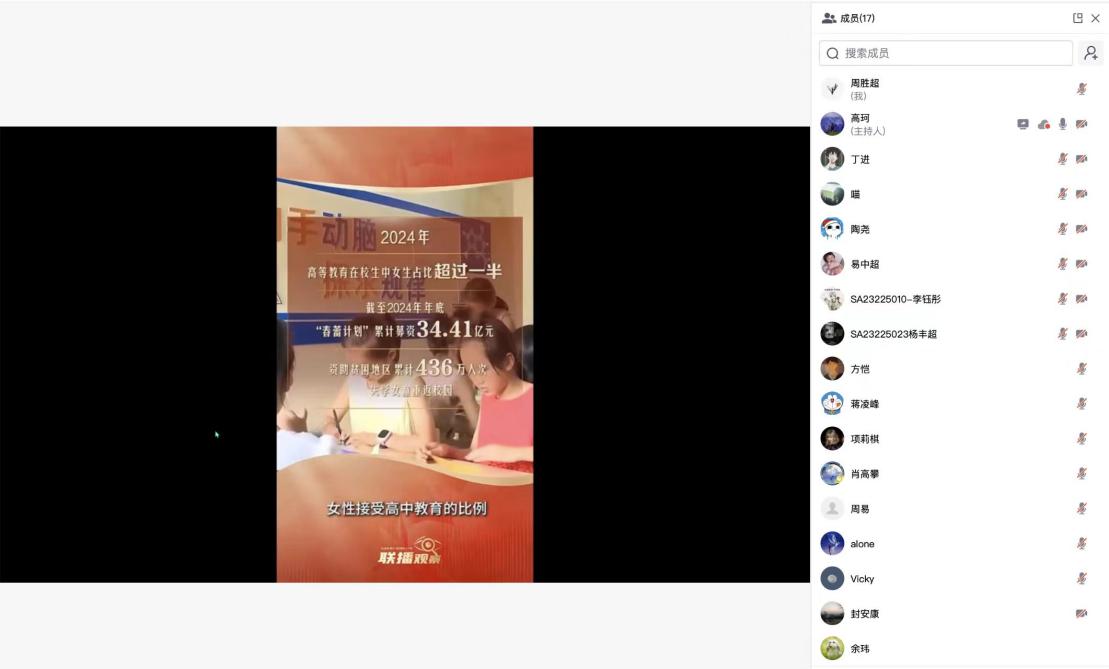 随后,支部在线播放妇女权益保障专题视频,全体党员共同学习习近平主席“坚持在发展中保障妇女权益,靠发展改善妇女生活,加快实现性别平等”的重要论述,直观理解妇女权益保障的时代意义与实践方向。