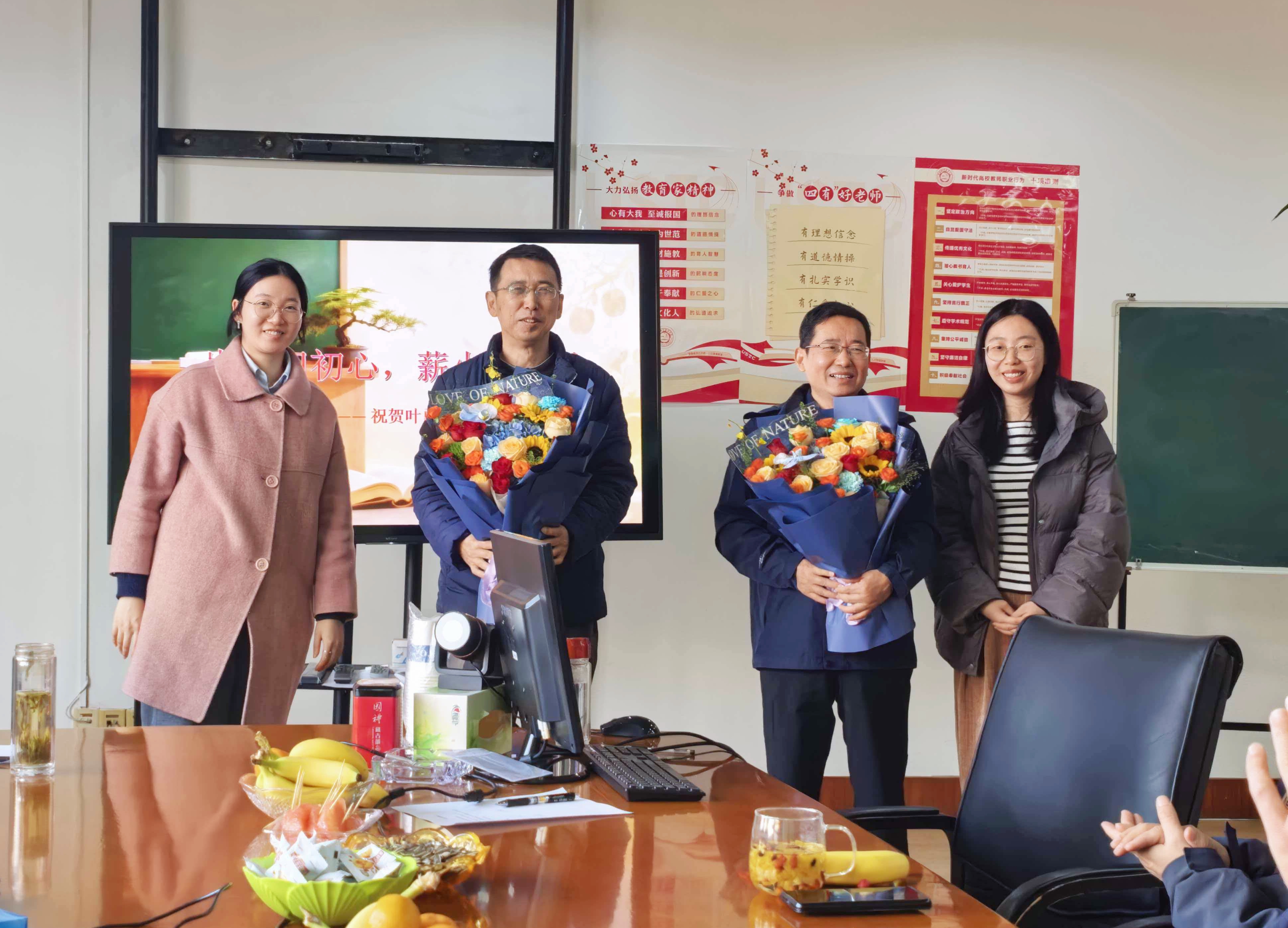随后,学院青年教职工代表张睿智、彭晨,向叶勇、石竹两位老师献上鲜花。鲜花承载着全体教职工对前辈的敬意,更象征着教育初心与育人使命的薪火相传。